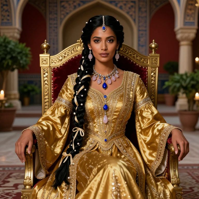 A stunning Persian princess with deep brown eyes and soft bronze skin sits on a velvet throne made of inlaid wood and brass, wearing an intricate golden and emerald gown of silk that flows dramatically around her. Her long black hair is styled in intricate braids adorned with delicate silk ribbons and small pearls. Around her neck hang silk jewels—crystal drops, rose quartz, and lapis lazuli—each glowing subtly under the soft candlelight. The setting is a luxurious royal palace in ancient Persia, with lush gardens and arches painted in rich reds and blues.