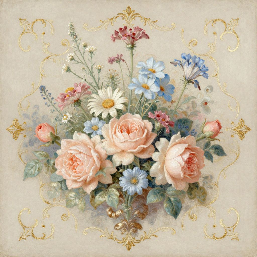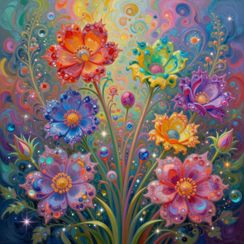 Flowersdrawings capturing a whimsical garden scene filled with fantastical flowers in imaginative shapes and hues, blending fantasy art with floral motifs, featuring intricate details and a dreamlike atmosphere with soft lighting and ethereal textures.