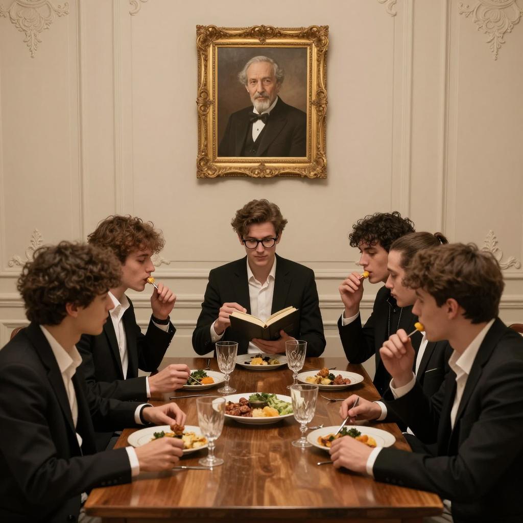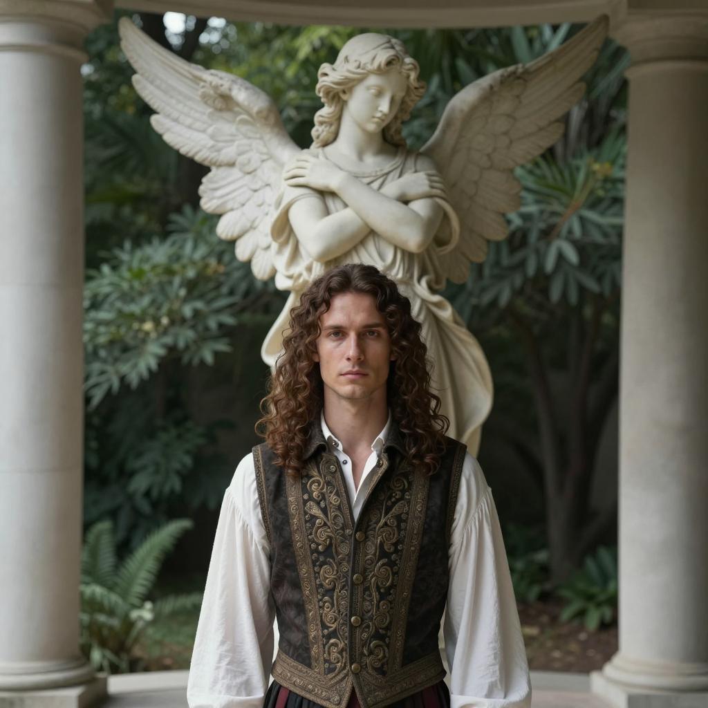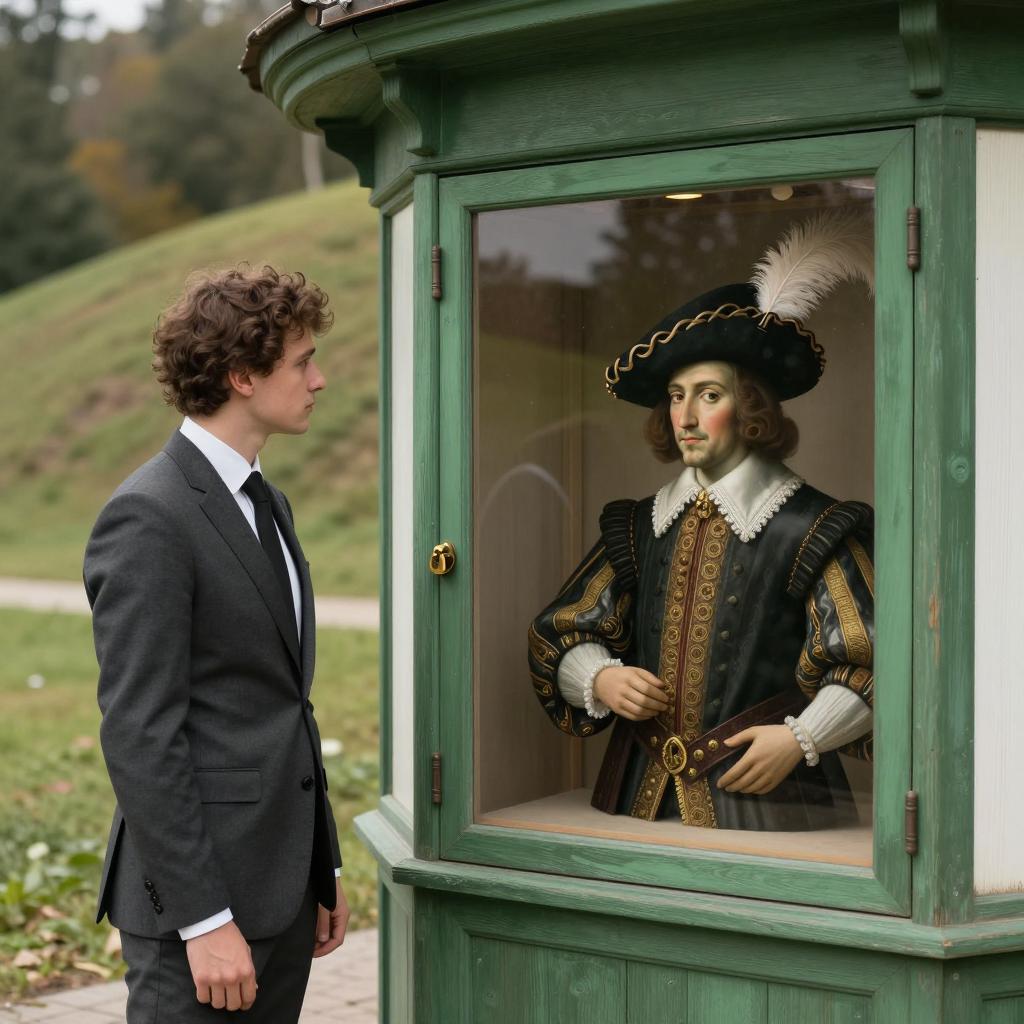 Man in dark gray suit with white shirt and black tie stands to the left, looking at a glass display case. Display case has a painted portrait of a man in elaborate Renaissance attire with a feathered hat. Background shows a curved, green-painted wooden structure with vertical white columns. Man has short, curly brown hair. Display case has a brass lock. Tree-covered hill in the background.