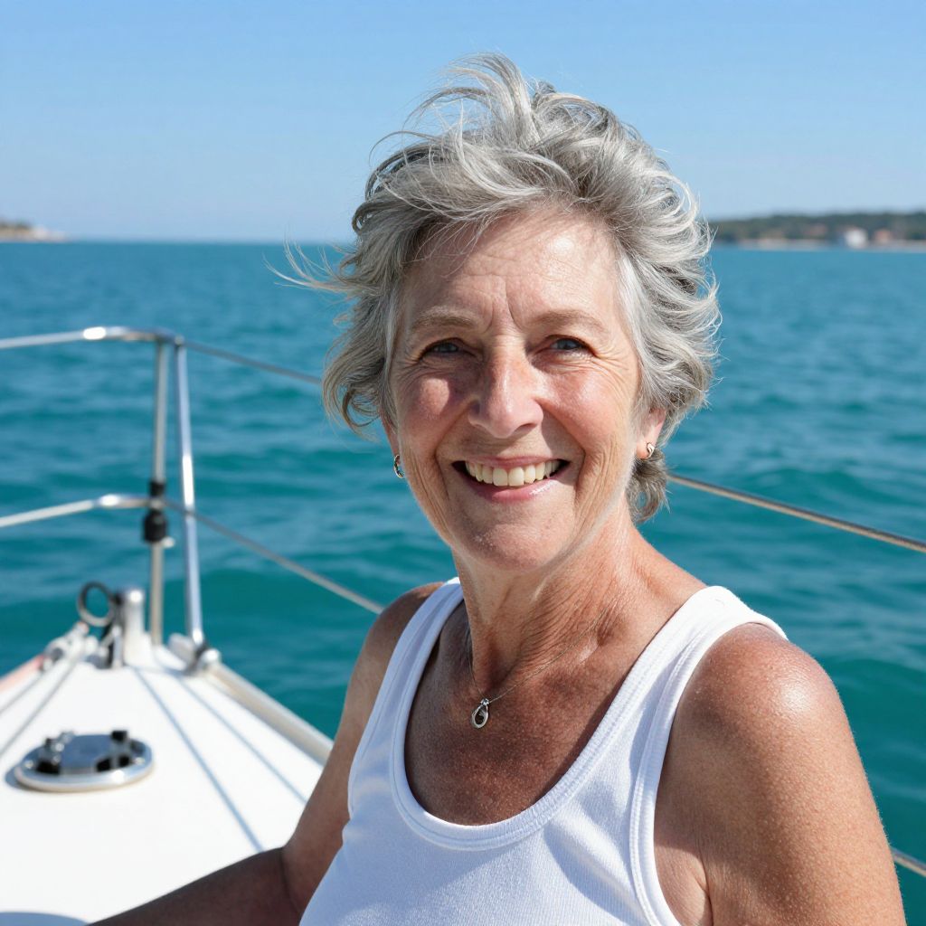 Photograph of a middle-aged woman with short, wind-swept gray hair and fair skin, smiling at the camera. She wears a dark navy blue, textured zip-up sweater. In the background, a clear blue sea stretches out to the horizon with distant hills and a few small white buildings. To her left, part of a white sailboat with a metal railing is visible. The bright sunlight casts sharp shadows, emphasizing the textures of her hair and sweater. The overall mood is cheerful and relaxed, suggesting a sunny day on a boat.