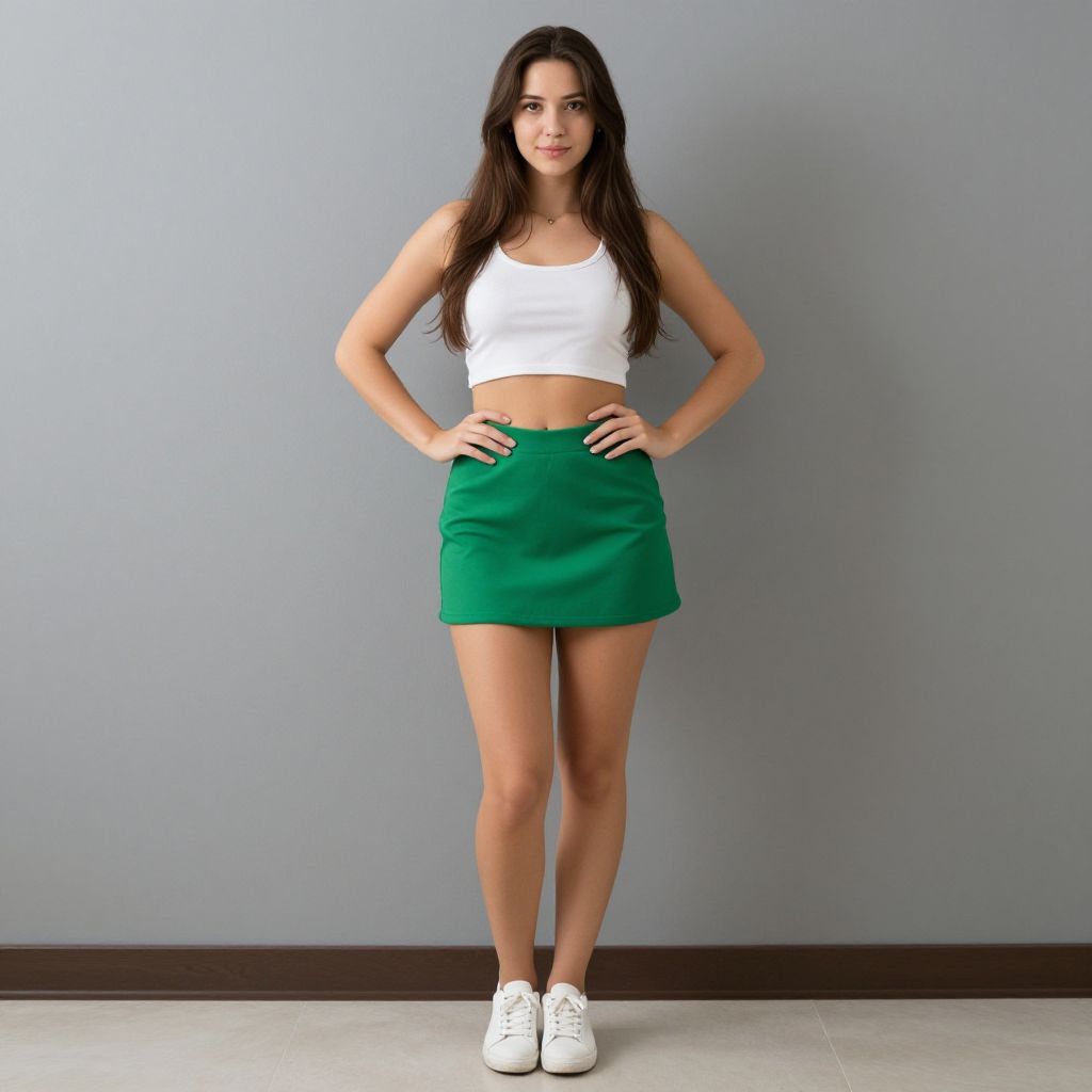 Photograph of a young woman standing against a plain, light gray wall with a dark brown baseboard. She has long, straight, dark brown hair and a fair skin tone. She is wearing a white, sleeveless, cropped tank top that reveals a bit of her midriff and a high-waisted, green, knee-length skirt. She also has on white, lace-up sneakers. Her hands are resting on her hips, and she is looking directly at the camera with a neutral expression. The floor is light gray concrete. The overall style is casual and sporty.