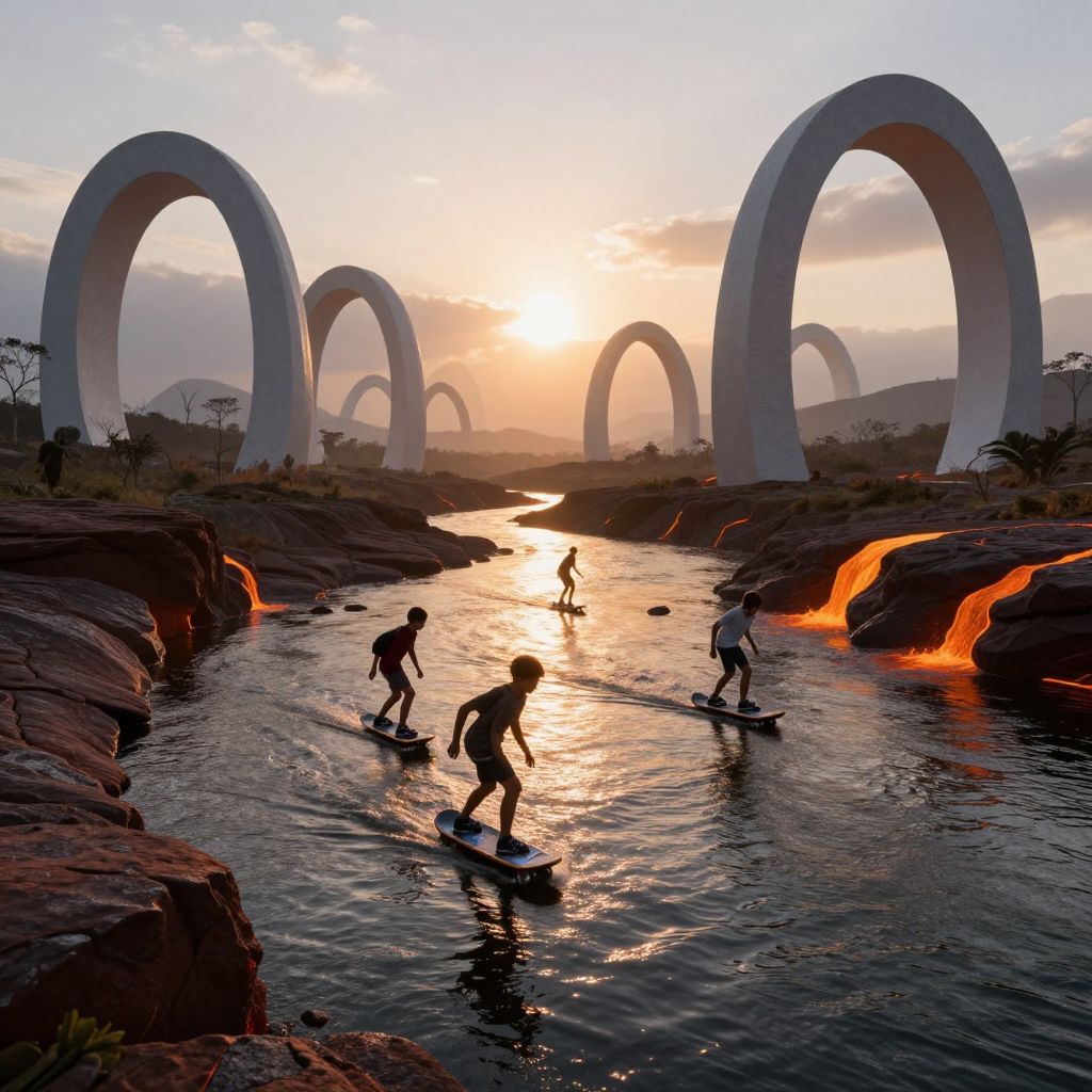 Children glide effortlessly on skateboards across a shimmering river, navigating a surreal landscape of stacked, ethereal archways that pierce the sky, while molten lava flows ominously along the rocky shores.