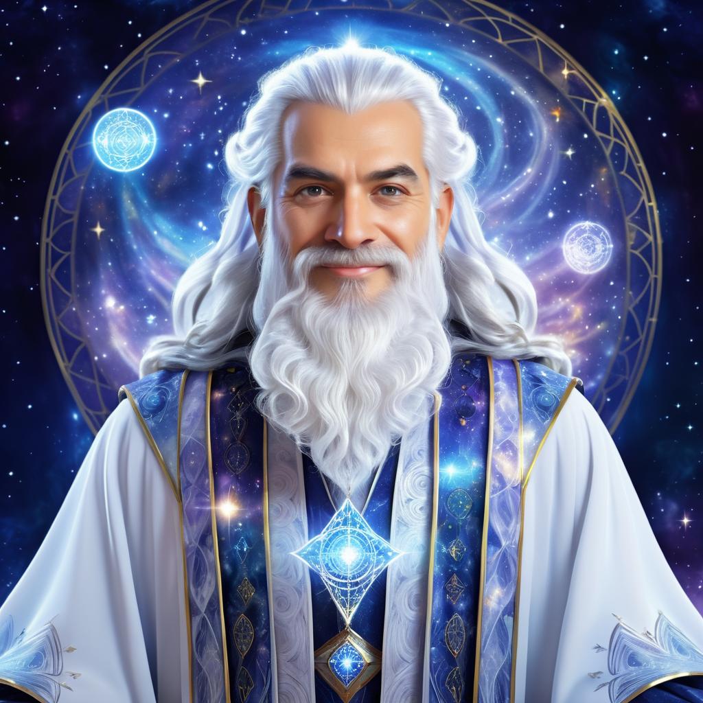 Digital portrait of a male wizard with a long white beard and hair, wearing ornate blue and white robes decorated with celestial and mystical patterns. The wizard is smiling gently against a cosmic background featuring stars and magical glowing symbols, evoking a fantasy and magical atmosphere.
