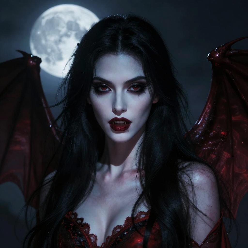 Digital artwork of a pale, strikingly beautiful woman with long, black hair and dark red lips. She has piercing, dark eyes and is wearing a red, lace-trimmed top. She has large, bat-like wings with a red, glossy texture. The background features a bright, full moon in a dark, cloudy night sky. Her expression is intense and mysterious, adding to the Gothic, supernatural atmosphere. The lighting highlights her face and wings, casting shadows that enhance her otherworldly appearance. The image has a high contrast, with deep blues and blacks accentuating the dramatic, eerie mood.