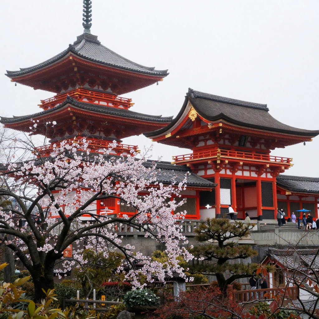 Japanese temple designs showcasing intricate wooden architecture, vibrant red and gold accents, surrounded by serene gardens with cherry blossoms in full bloom, misty morning ambiance