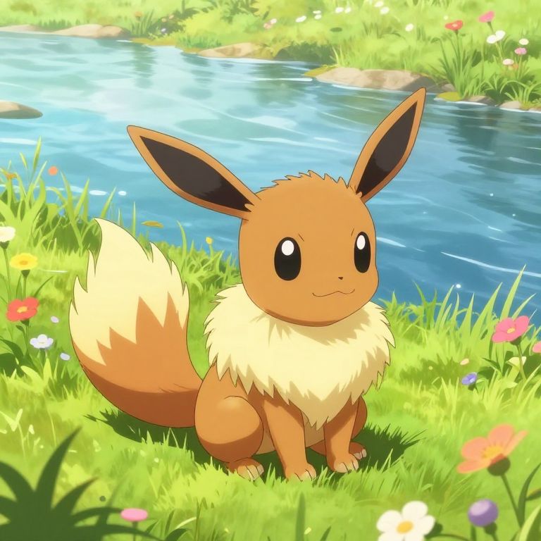 A vibrant digital illustration of an Eevee, a small, fox-like Pokémon with large black-tipped ears, a fluffy cream-colored collar, and a bushy orange tail with a cream tip. Eevee sits on bright green grass beside a clear blue stream, surrounded by colorful wildflowers. The sunlight highlights the scene, creating a cheerful and serene atmosphere. The background features a lush, grassy area with more flowers and a gently flowing stream. The image has a soft, cartoon-like style with clean lines and bright colors.