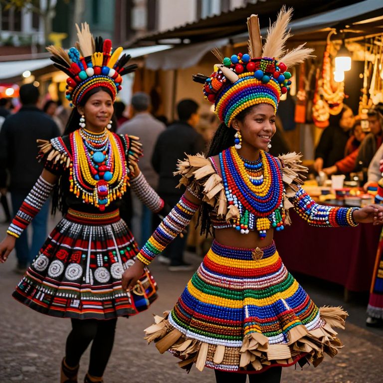 Braeds decorated with colorful beads and natural elements, festive cultural setting, vibrant market scene, rich textures and patterns, warm ambient lighting, joyful expressions, dynamic composition capturing movement