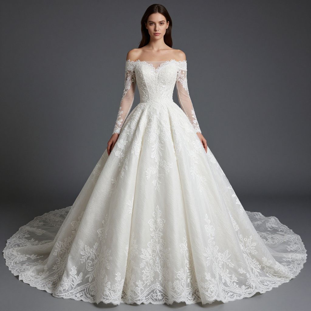 Photograph of a Caucasian woman with long, straight black hair wearing an off-the-shoulder, long-sleeve, white lace wedding gown. The gown features intricate floral lace patterns, a fitted bodice, and a full, floor-length skirt that spreads into a slight train. The lace extends onto the long sleeves, adding a delicate, semi-transparent overlay. She stands against a dark gray studio background, with her hands resting on the skirt's sides, exuding elegance and grace. Her expression is neutral, and the lighting highlights the gown's texture and details.
