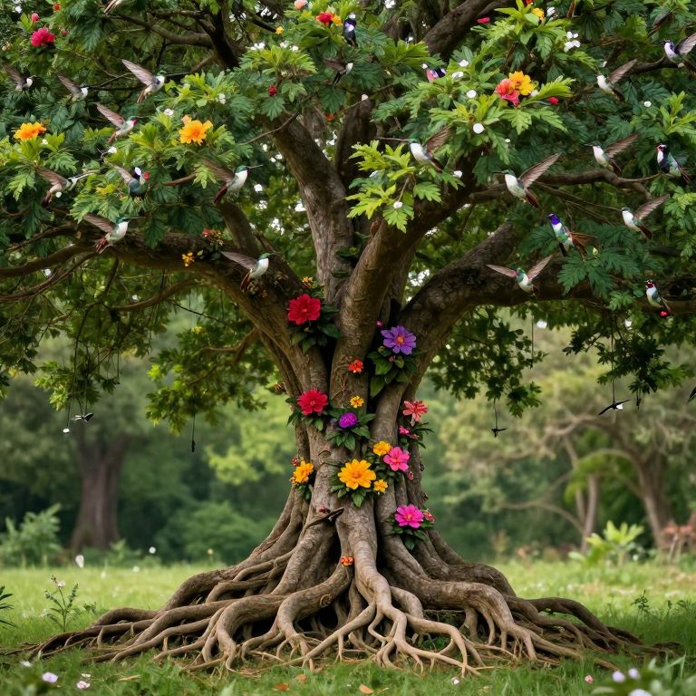 In a realm where nature defies convention, a tree stands as a paradox of serenity and wonder, its roots entwined with vibrant blooms and its branches cradling hummingbird constellations, evoking a profound sense of harmony and the boundless beauty of life's interconnectedness.