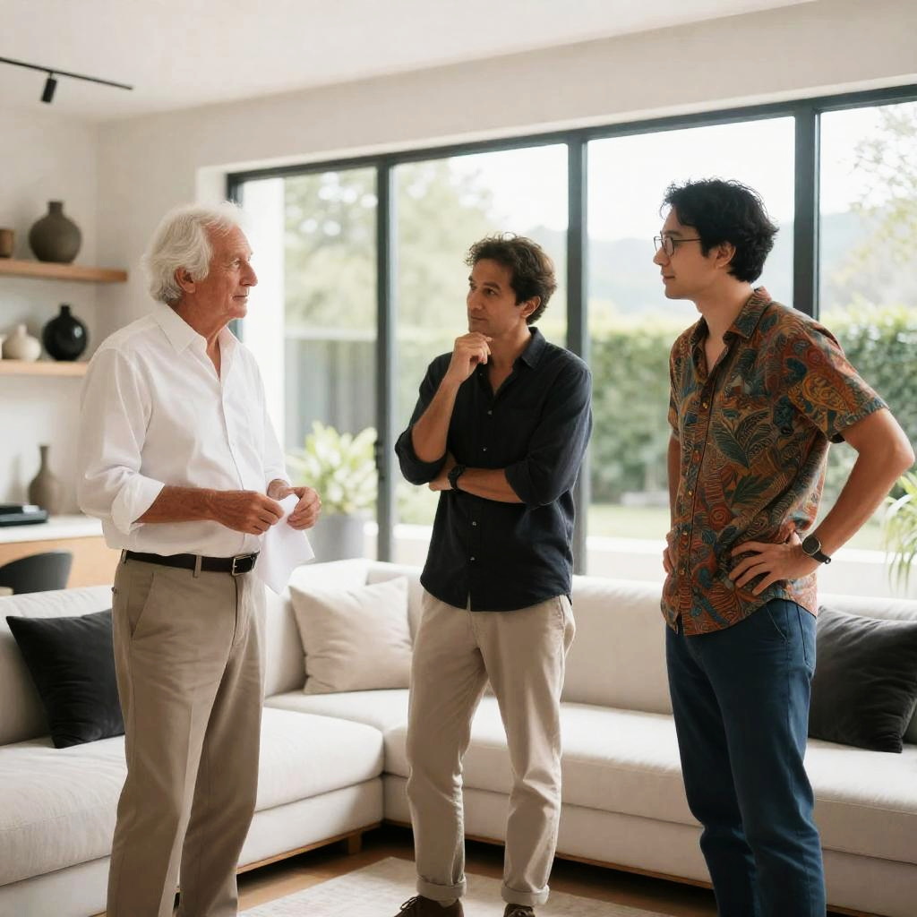 Three men in a modern living room. First man with white hair, white shirt, and beige pants holds a white cloth. Middle man with dark hair, black shirt, and beige pants touches chin thoughtfully. Third man with dark hair, glasses, colorful patterned shirt, and blue pants stands with hands on hips. Large glass windows in background. Bright natural light. White couch with black and white pillows. Shelves with decorative items on left. Greenery outside visible through windows.