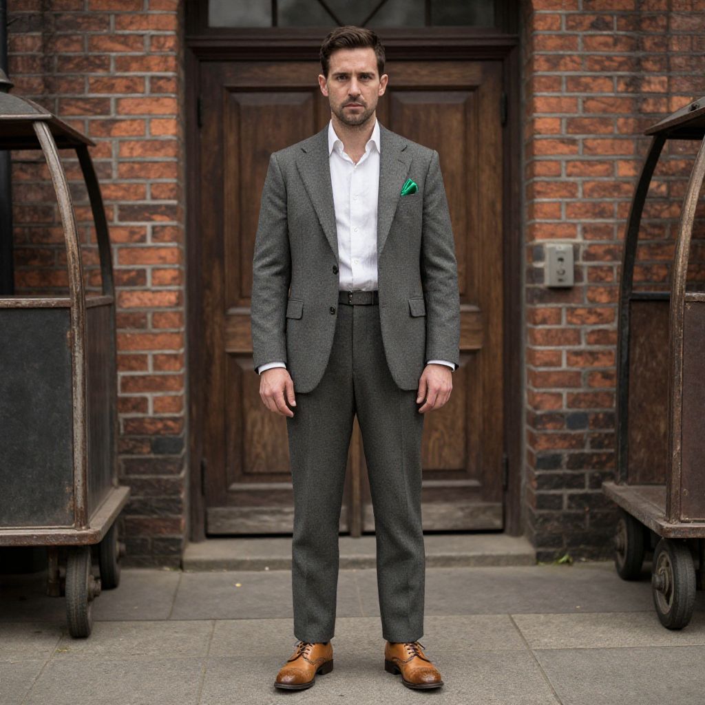 A man, medium grey suit, white linen dress shirt, vibrant green pocket square, tan leather brogues, no tie, historic brick building, large wooden doors, vintage luggage carts outside, collodion wet plate style, confident expression. Man has masculine face and piercing eyes