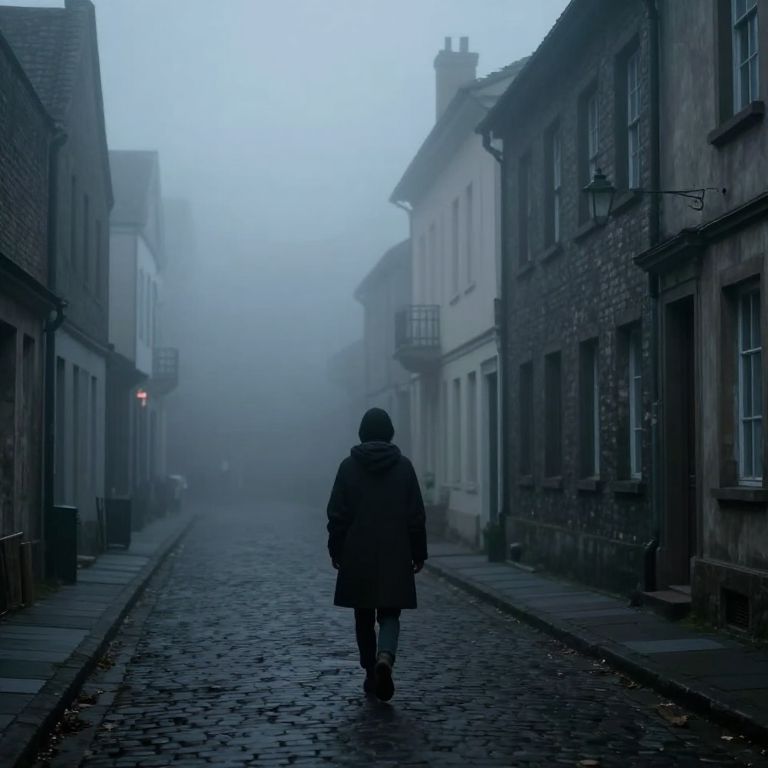 In the hushed embrace of fog, a solitary figure traverses a shadow-draped street, where whispers of forgotten stories linger in the air, evoking a profound sense of solitude and the quiet weight of history.