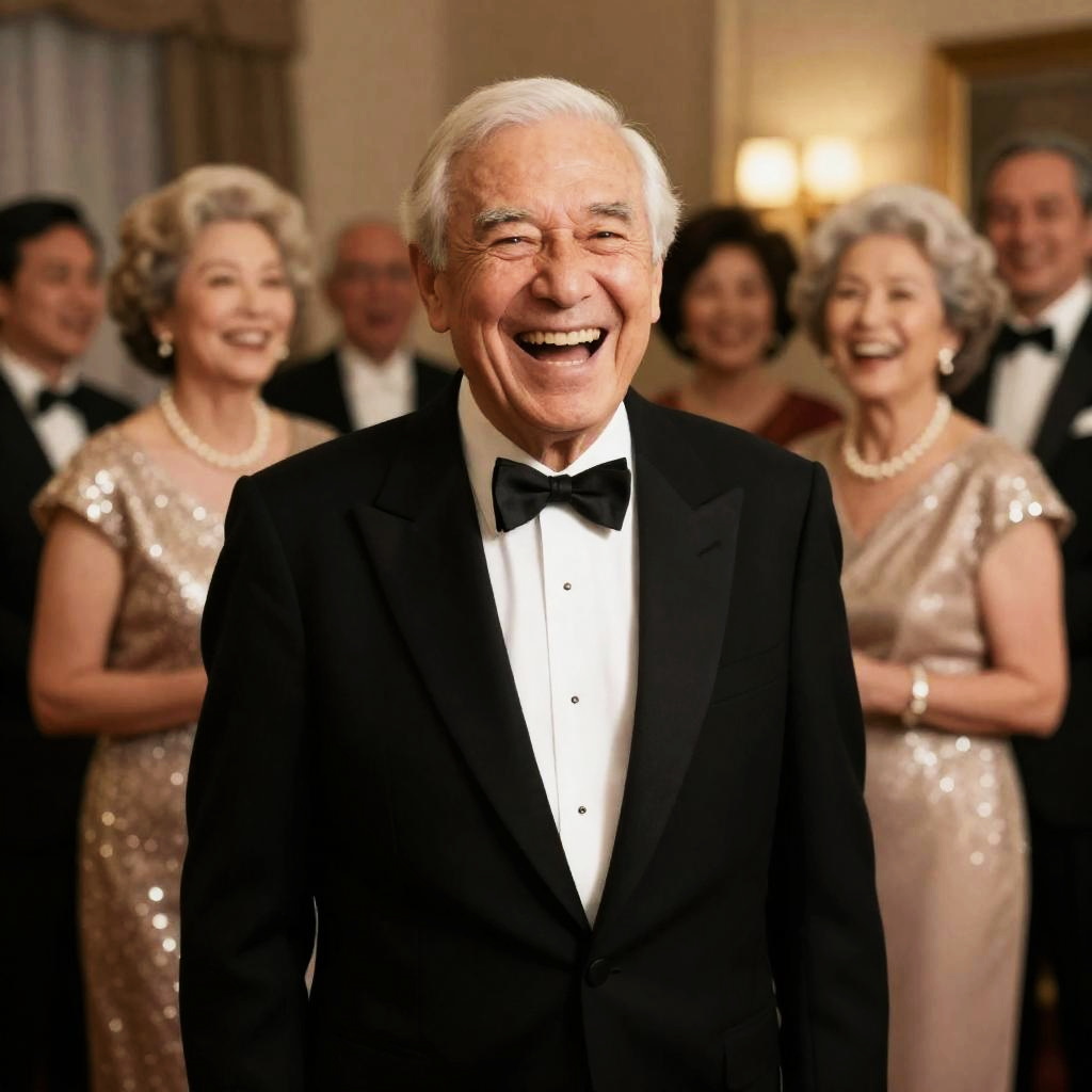 Old man in black tuxedo with bow tie, laughing loudly, front and center. Background: elderly women in elegant dresses, sparkling sequins, smiling and laughing. Warm indoor lighting. Group of people, social event, mid-century style.