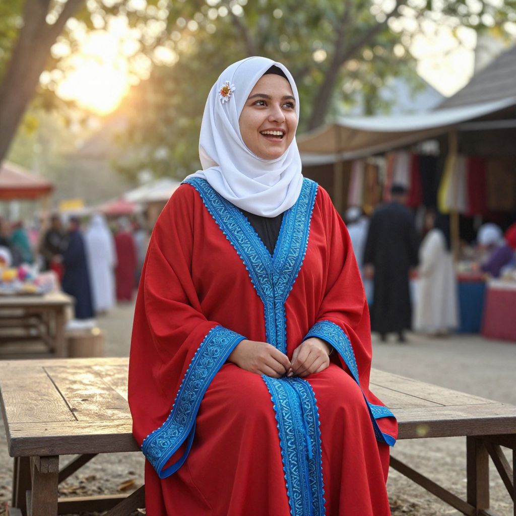 A lively outdoor scene showing a woman in a festive Eid costume, dressed in a bright red and blue embroidered jilbab with a flowing border and a white hijab secured with a floral pin, sitting on a wooden bench in a village market during Eid morning, her face glowing with joy, golden sunlight filtering through trees in the background.. The woman has big breasts and cute face