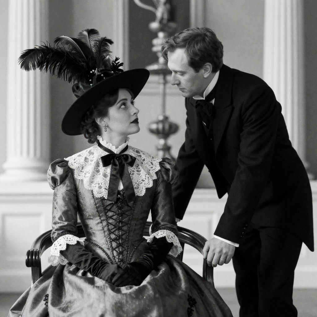 Black-and-white photograph of two people in Victorian-era clothing. Woman in intricate lace dress, low-cut bodice, and large sleeves. Man in patterned vest, shirt with ruffles, and matching skirt. They are kissing passionately, standing on ornate carpet. Background includes wooden furniture and decorative elements. Woman's hair is up, man's hair is dark and slicked back. Woman's dress has floral lace patterns, man's outfit has geometric designs. Woman's eyes are closed, man's eyes are partially visible. Both figures are mid-kiss, bodies pressed together.