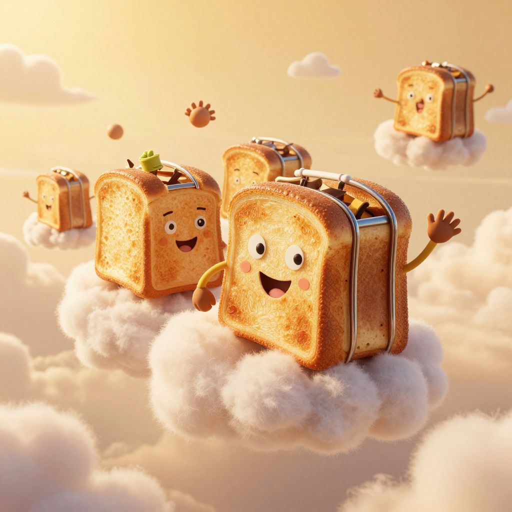 A whimsical CGI illustration features five anthropomorphic slices of toast with smiling faces floating on fluffy white clouds against a warm, golden sunset sky. The toast slices, each with arms raised in joy, have brown, toasted textures and metal clasps on top. One slice has a small green leaf on its head, adding a playful touch. The scene is bright and cheerful, with soft sunlight casting gentle shadows, creating a dreamy, surreal atmosphere. The toast slices are scattered across the frame, with one in the foreground and others in the background.