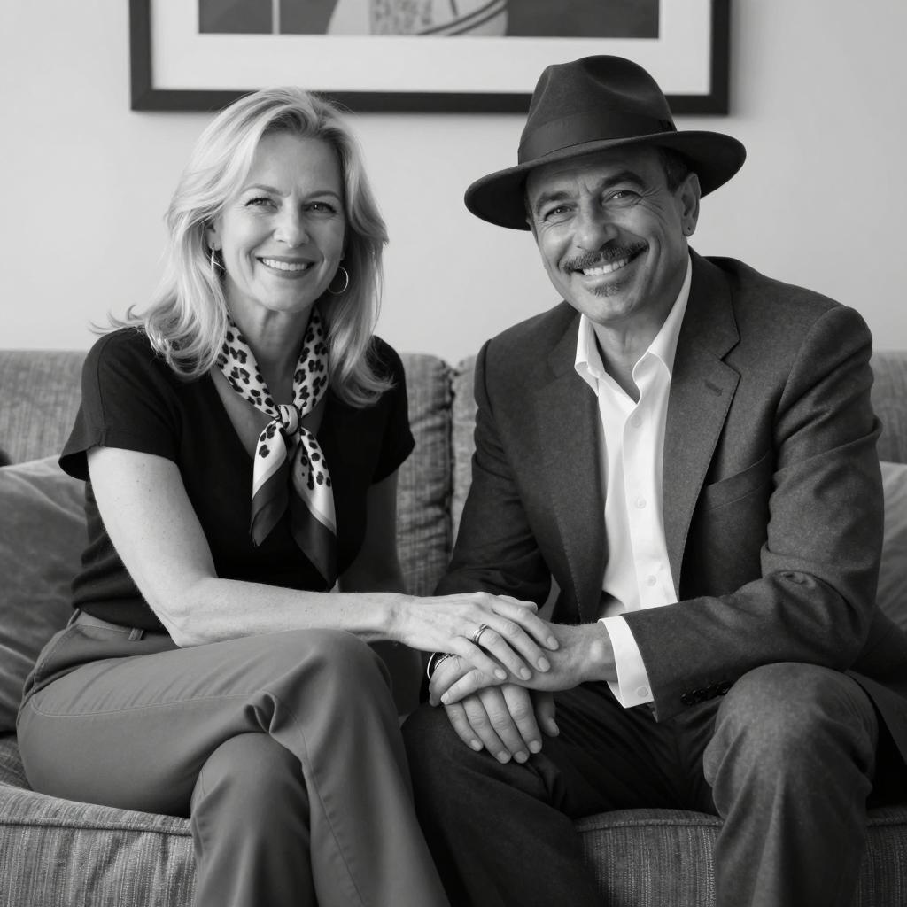 Black and white photograph of a smiling middle-aged man wearing a suit and fedora hat, and a blonde woman with a leopard print scarf and hoop earrings, sitting closely on a couch. The man is holding the woman's hands as she sits with crossed legs. The background features a plain wall and a framed abstract picture.