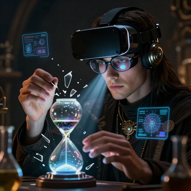 Create a hyperrealistic portrait of an enigmatic alchemist immersed in potion creation, illuminated by light refracting through shattered hourglass shards, casting prismatic beams across their visage. Their features blend ancient mystique with futuristic gadgetry, as seen through the advanced VR headset bridging virtual reality and magical realms. The subject's gaze exudes deep concentration yet hints at curiosity and wonder. This portrait aims to evoke an emotional spectrum from focus to awe, showcasing intricate details such as holographic displays hovering around their hands and subtle reflections on their glasses, emphasizing their mastery of arcane arts.