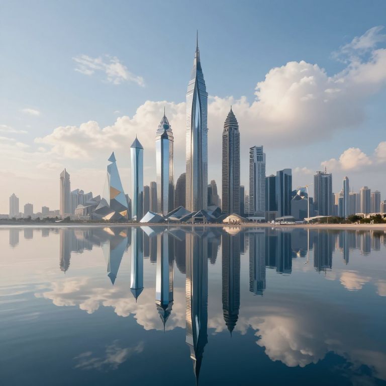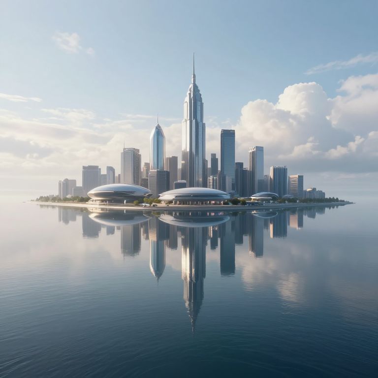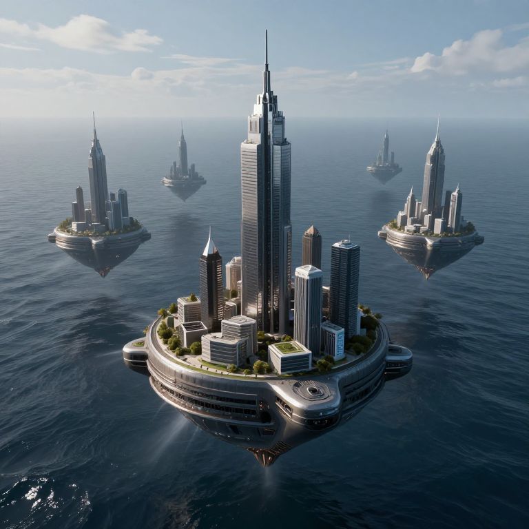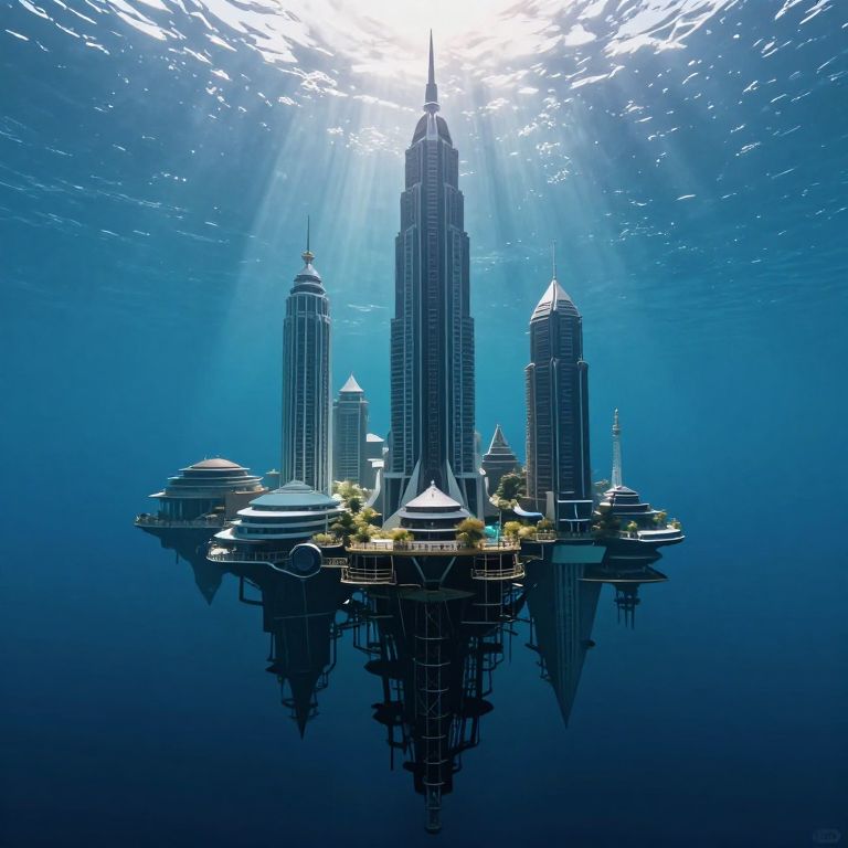 Surreal skyscrapers float serenely beneath the ocean's surface, their spires reaching toward the light above while intricate scaffolding descends into the depths, creating a mesmerizing blend of futuristic architecture and aquatic life.