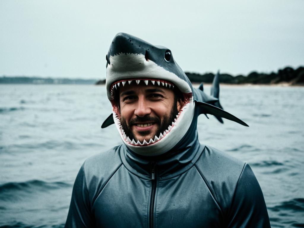 Shark Suit face swap, man in a shark suit with a shark on his head