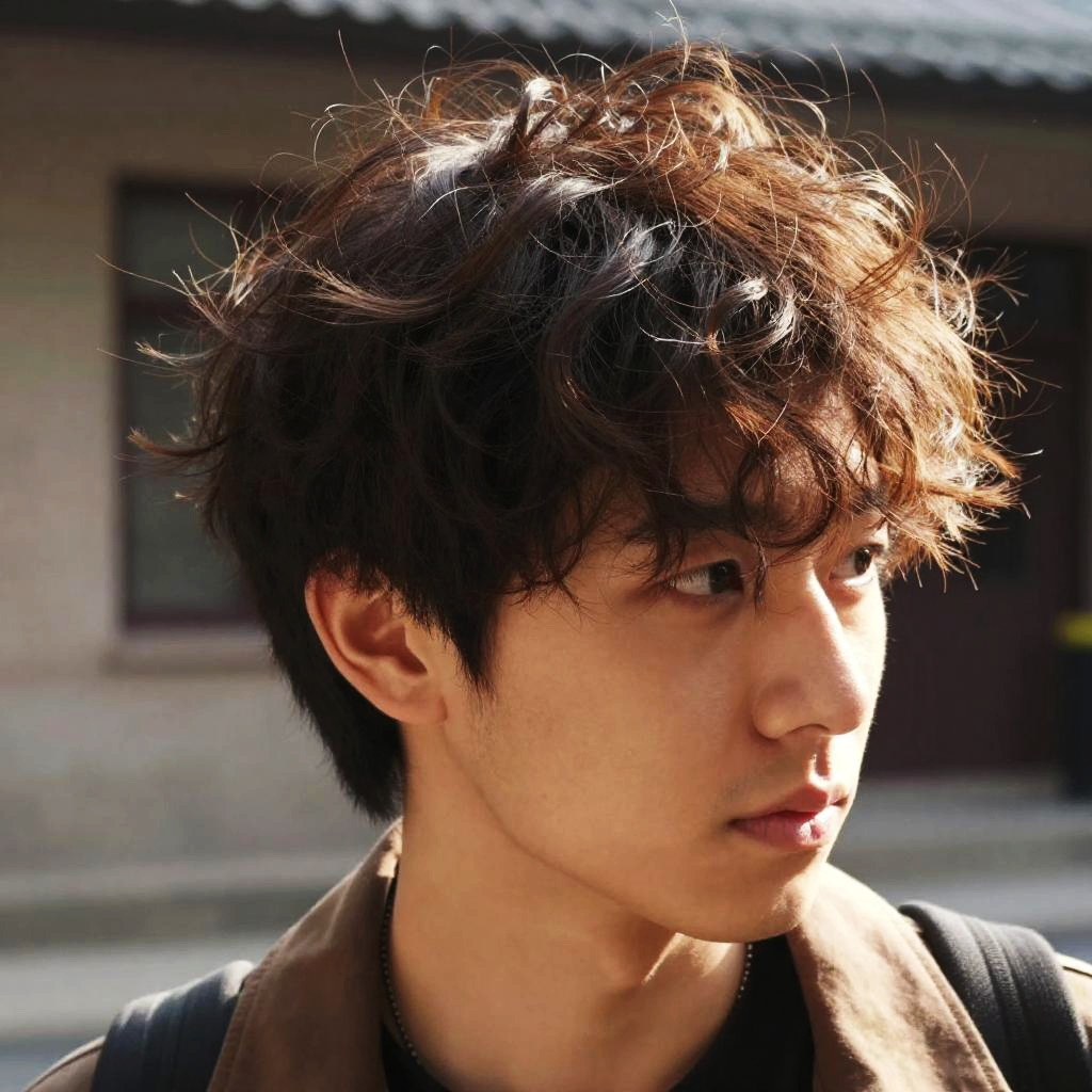 Asian men with medium hairstyles, messy tousled look, natural volume, sunlit outdoor setting, casual fashion, warm color palette, dynamic composition, detailed facial features