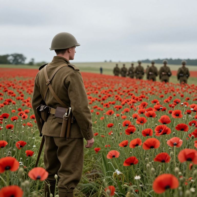 A soldier stands in a field of red poppies, looking towards a group of soldiers in the distance, evoking the somber memories of the Battle of the Somme during World War I.