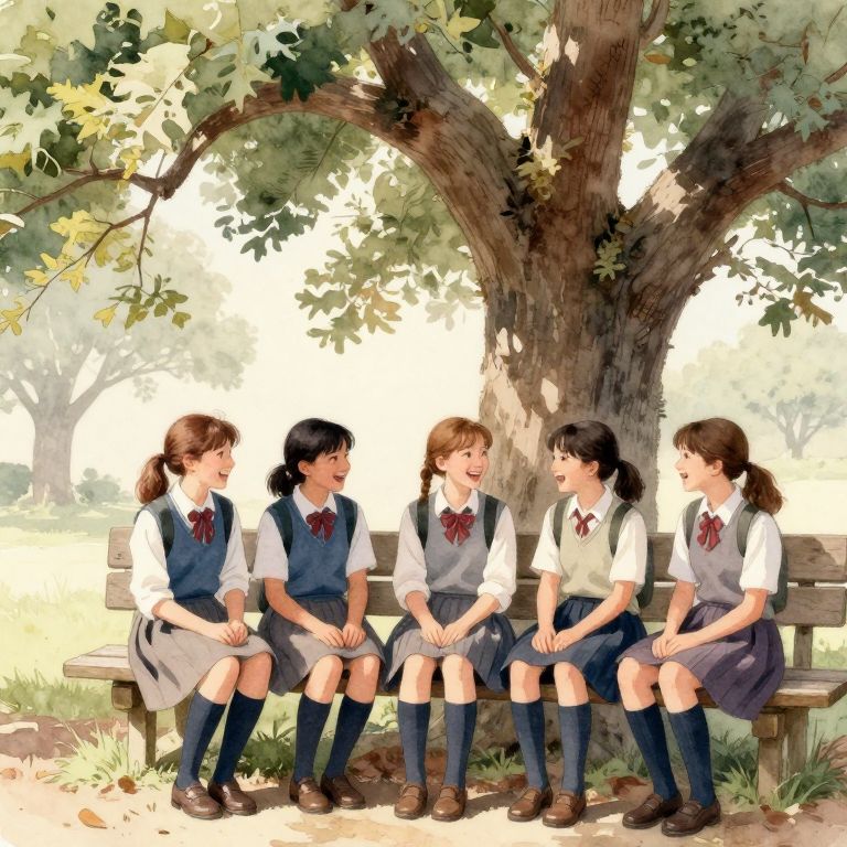 Colegialas sitting on wooden benches under big oak trees, wearing traditional school attire with knee-high socks, engaging in laughter and conversation, painted with soft watercolor textures, pastel tones evoking nostalgia and warmth