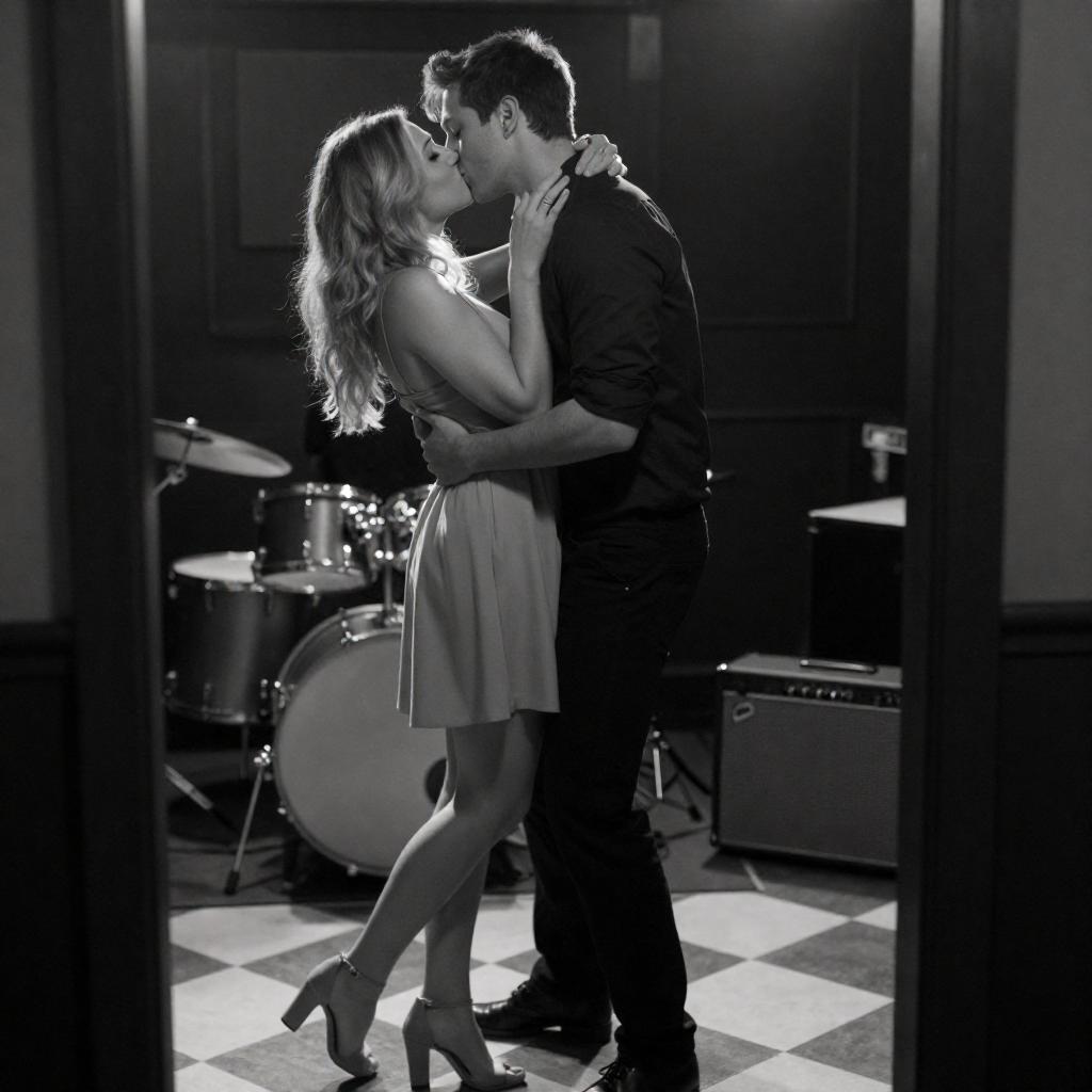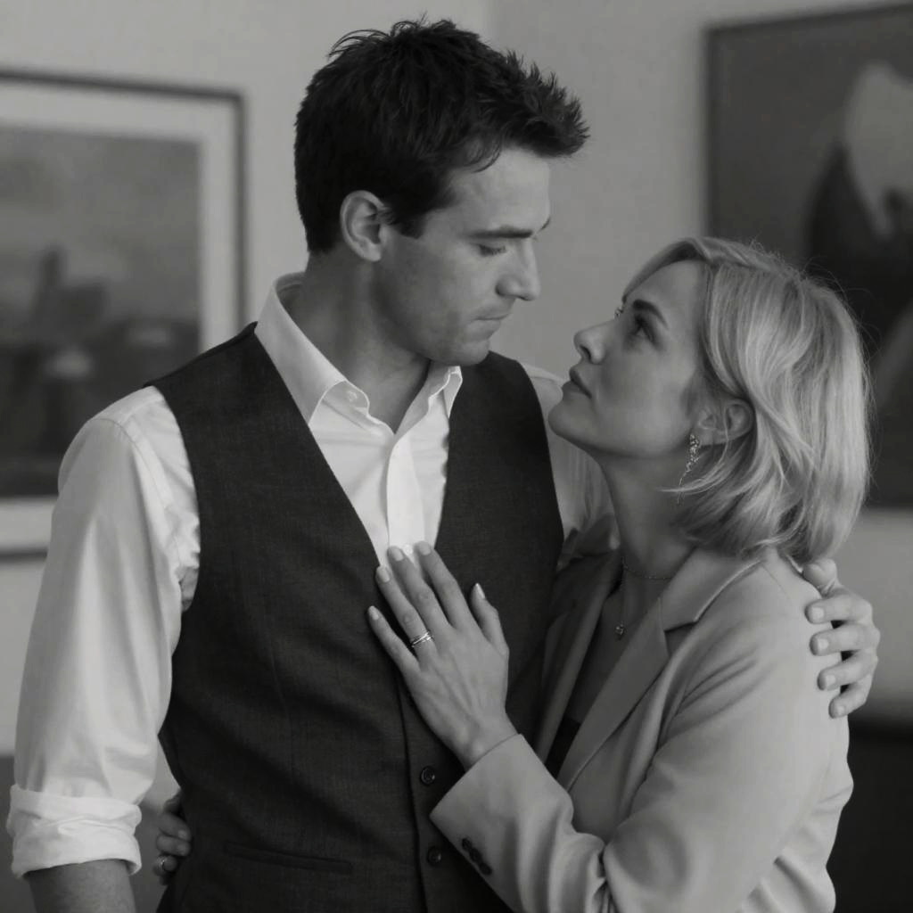 Black and white photograph of a blonde woman with curled hair and a low-cut black dress, gently holding the chin of a seated man with short hair. Man looks up at her, both with calm expressions. Patterned wallpaper and furniture in the background. Woman's left hand on man's face, right hand supporting his head.
