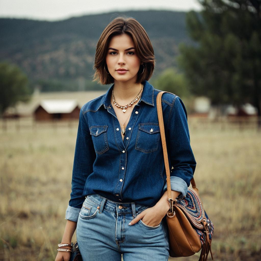 Ladies trouser outfit,1girl, solo, pants, outdoors, tree, brown hair, long hair, shirt, jewelry, standing, full body, earrings, denim, day, jeans, sandals, looking at viewer, brown eyes, blue pants, high-waist pants, high heels