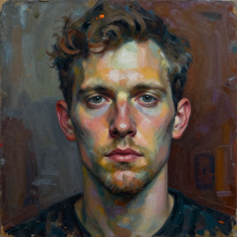 A digital painting of a young Caucasian man with light skin and short, curly brown hair. He has blue eyes, a slight beard, and a neutral expression. The background is abstract with dark, textured brushstrokes in shades of brown, purple, and blue. The painting uses a mix of vibrant and muted colors to highlight his face, creating a realistic yet slightly stylized effect. His face is centrally positioned, with the background blending into the edges, drawing focus to his face. The style is reminiscent of impressionist portraiture, with visible brushstrokes adding texture.