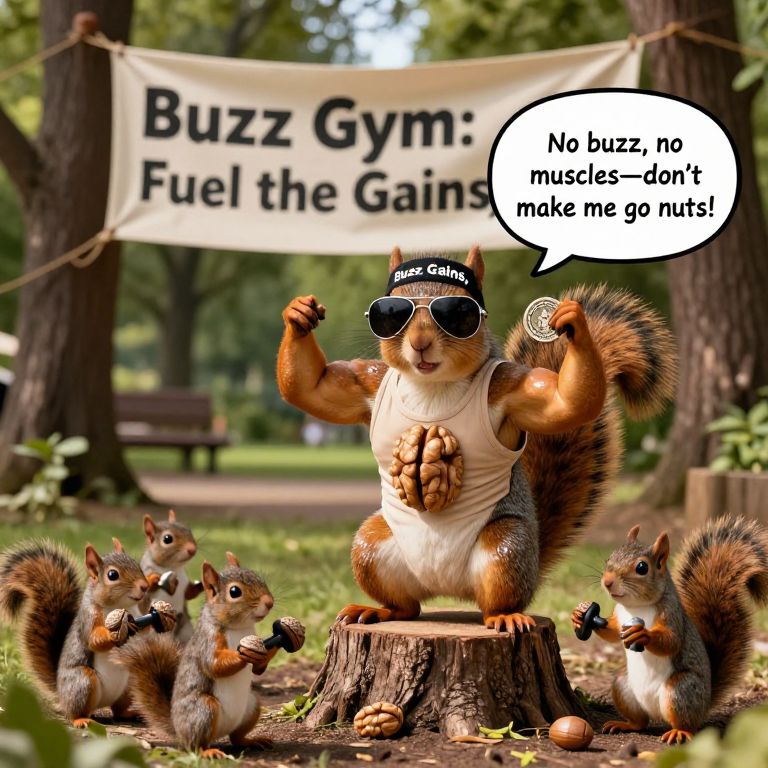 A buff, shirtless squirrel is dramatically flexing on a tiny tree stump in the middle of a park, His fur gleams in the sunlight as if it’s been oiled, and his comically oversized pecs and biceps are clearly fake—they’re just walnuts stuffed into a stretchy tank top, He’s wearing tiny aviator sunglasses and a headband that says “Buzz Gains, ” Nearby, a bunch of smaller, weaker squirrels look on in awe, holding tiny dumbbells made out of acorns, One of them is trying to copy his flex but looks hilariously uncoordinated, Behind them, a homemade banner hangs between two trees, reading: “Buzz Gym: Fuel the Gains, ” The buff squirrel points dramatically at the viewer with one paw while holding a buzz coin like a protein bar in the other, A speech bubble above him reads: “No buzz, no muscles—don’t make me go nuts!” The absurdity of a ripped squirrel running a gym powered by buzz makes this scene both ridiculous and hysterical