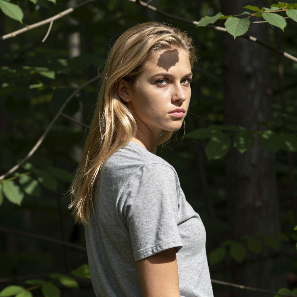 Photograph of a young woman with light blonde hair, wearing a gray t-shirt, standing in a dense forest. She has a serious expression, looking slightly over her shoulder. Background includes green foliage and tree branches. Sunlight filters through the leaves, casting shadows on her face. She is centered in the frame, facing right.