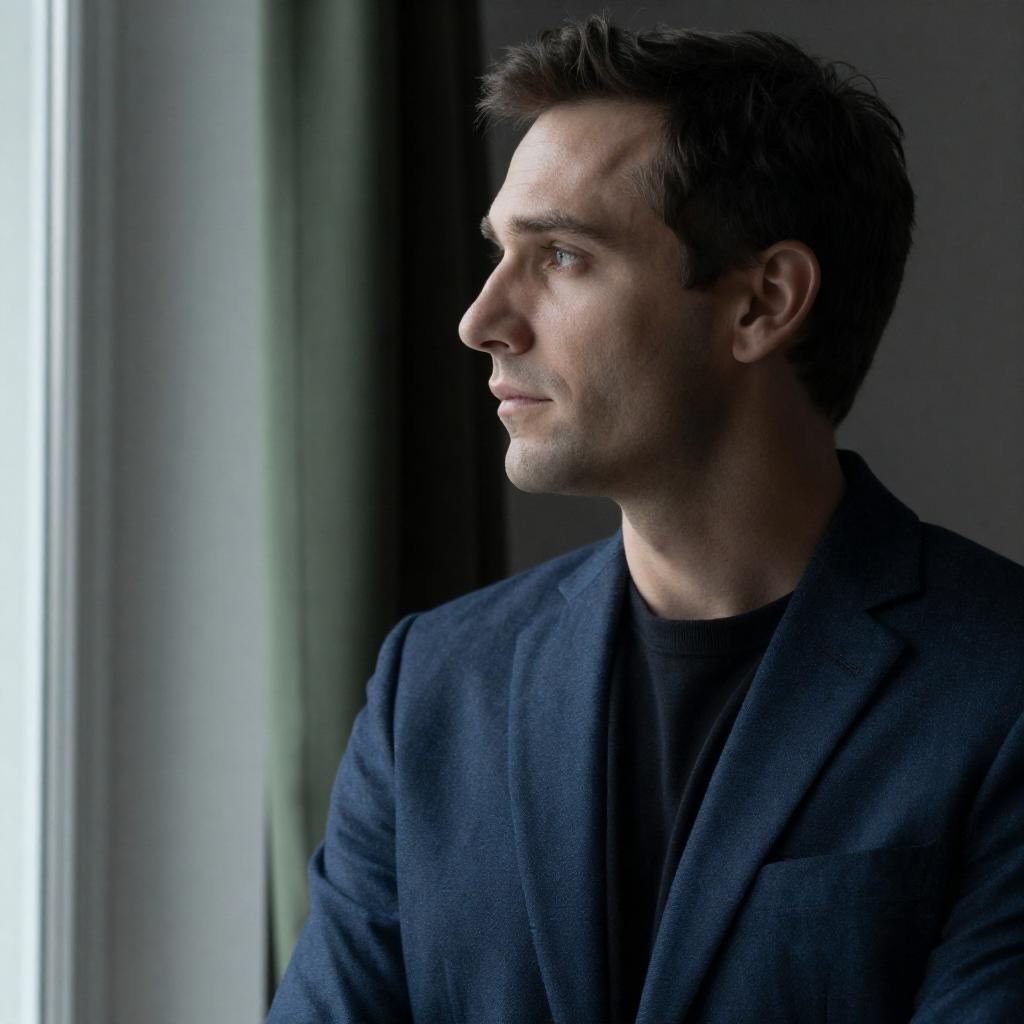 Photograph of a serious-looking man with short, dark hair and a light beard, wearing a dark green hooded jacket over a navy shirt. He is in profile, facing left, with a dimly lit background and a bright vertical light source on the left. The lighting creates a dramatic shadow on his face.
