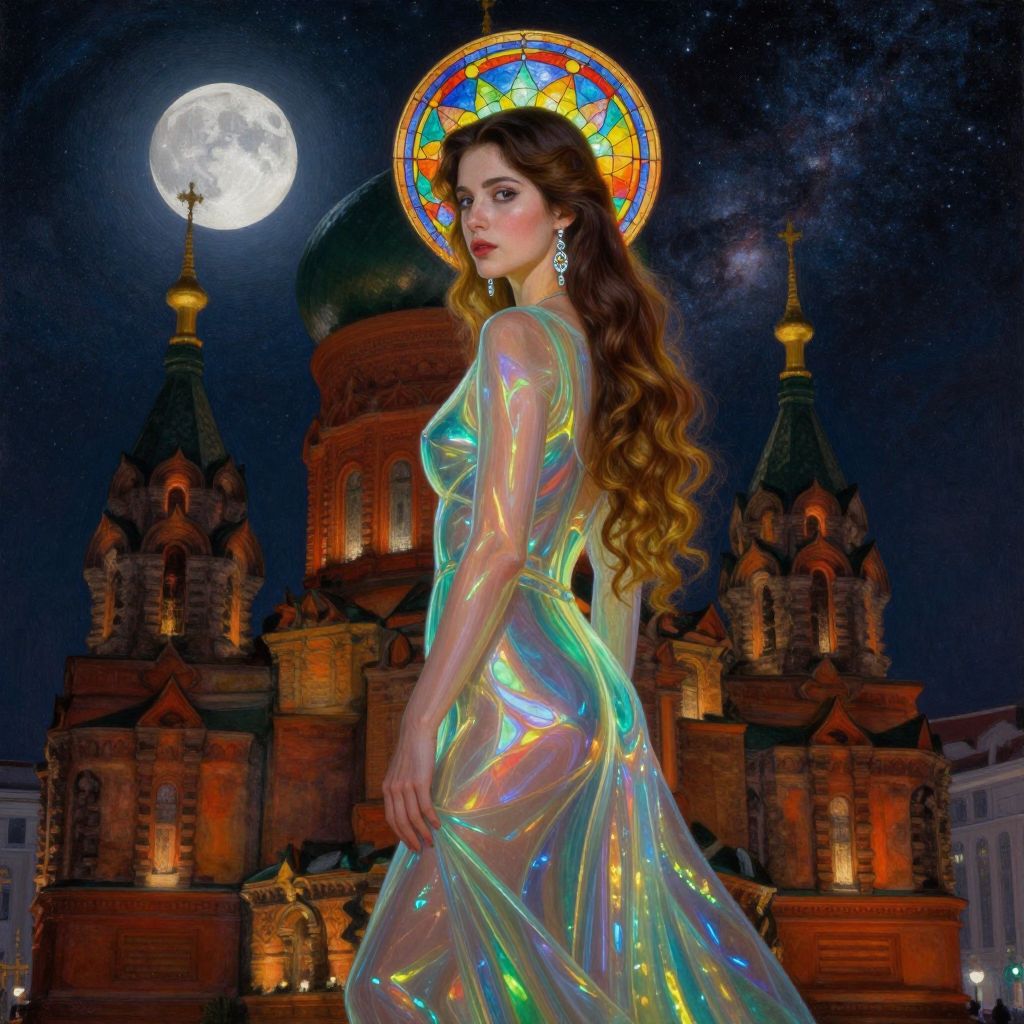 Digital artwork of a long-haired woman in a shimmering, rainbow dress, with a colorful halo, standing before a moonlit, ornate Russian Orthodox
