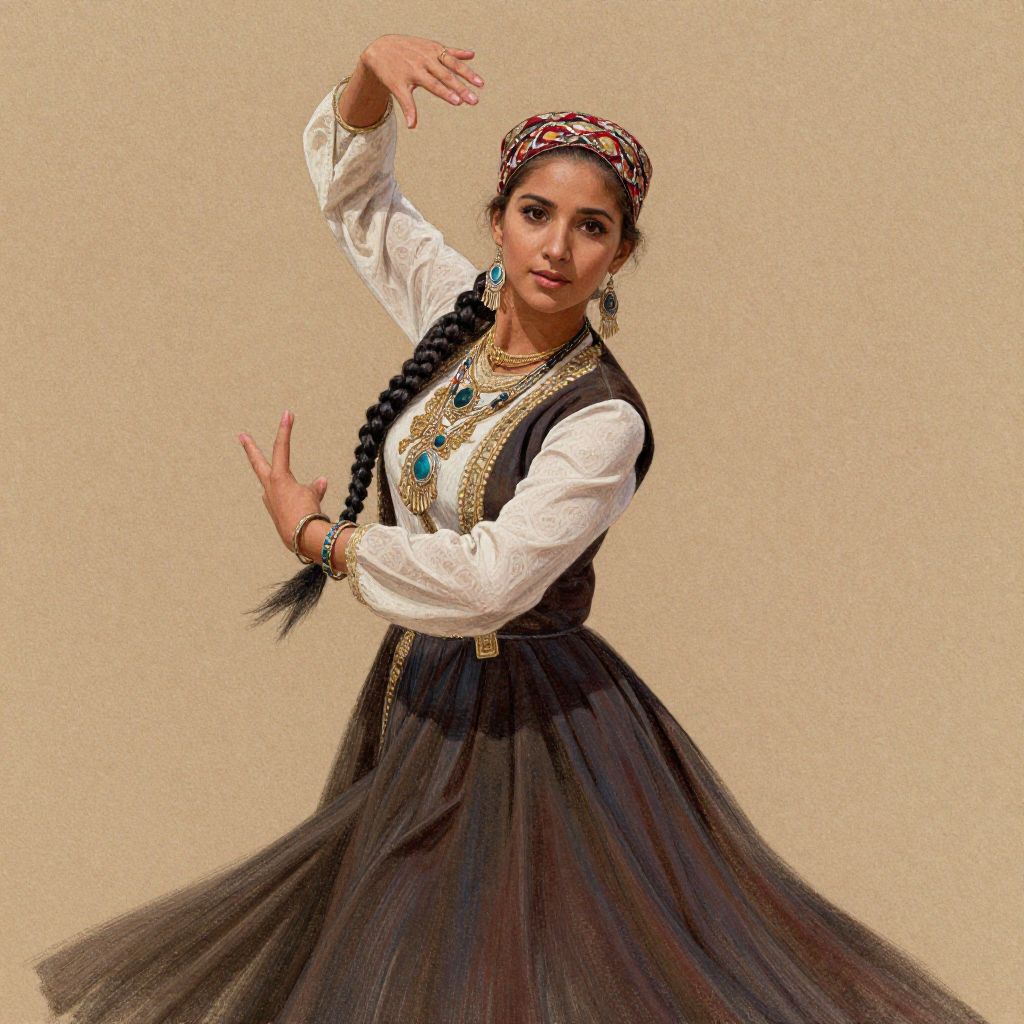 Photograph of a young woman with medium brown skin and dark hair in a single braid, wearing a white long-sleeved blouse, black velvet vest, and a black, tulle skirt. She has blue and gold jewelry, including earrings, necklace, and bracelets. Her head is adorned with a patterned headscarf. She is posing with one arm raised and the other bent, against a plain beige background. Her expression is focused, and her stance is elegant and graceful. The image has a slightly textured, digital painting-like overlay.