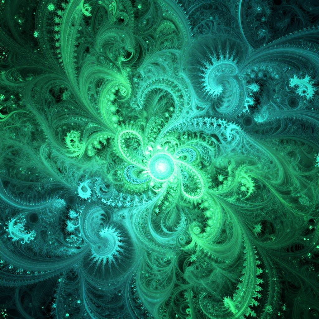Digital artwork featuring a vibrant, swirling pattern of green and turquoise fractals with glowing star-like accents against a dark blue background.