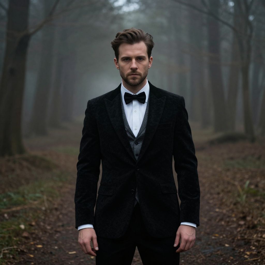 A photograph of a handsome man standing in a misty forest. He has short, styled brown hair and a light beard. He's wearing a black velvet suit with a white shirt, black bow tie, and a patterned grey vest. The forest background is dark and foggy, with tall trees and a dimly lit path. His serious expression adds a mysterious vibe to the scene.