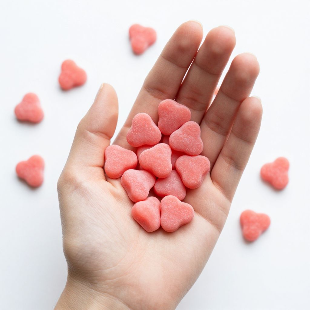 Photograph of a pale-skinned hand holding pink, sugary heart-shaped candies against a white background with scattered pink hearts.