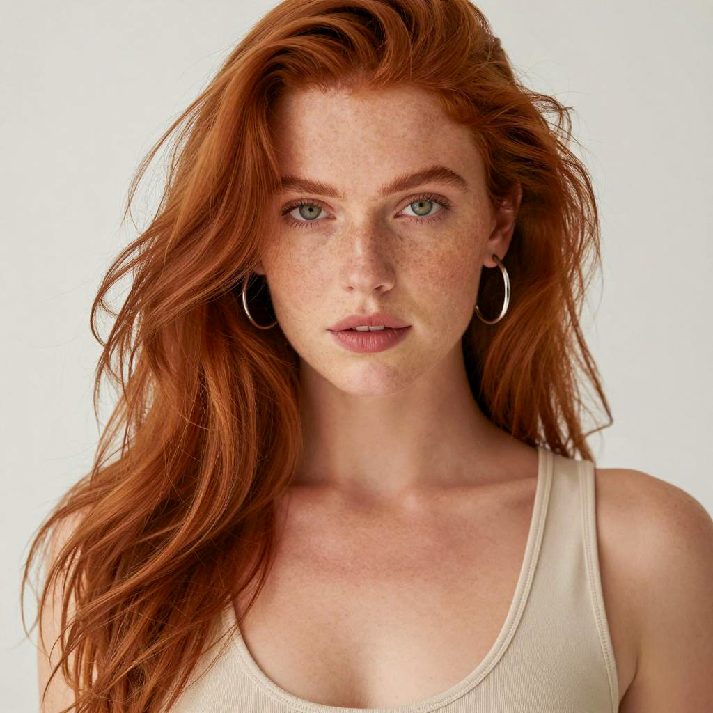 Photograph of a young woman with fair skin, freckles, and long auburn hair. She has brown eyes, full lips with light pink gloss, and wears a small gold hoop earring. She has a neutral expression. She is wearing a black sleeveless top. Background is blurred white.
