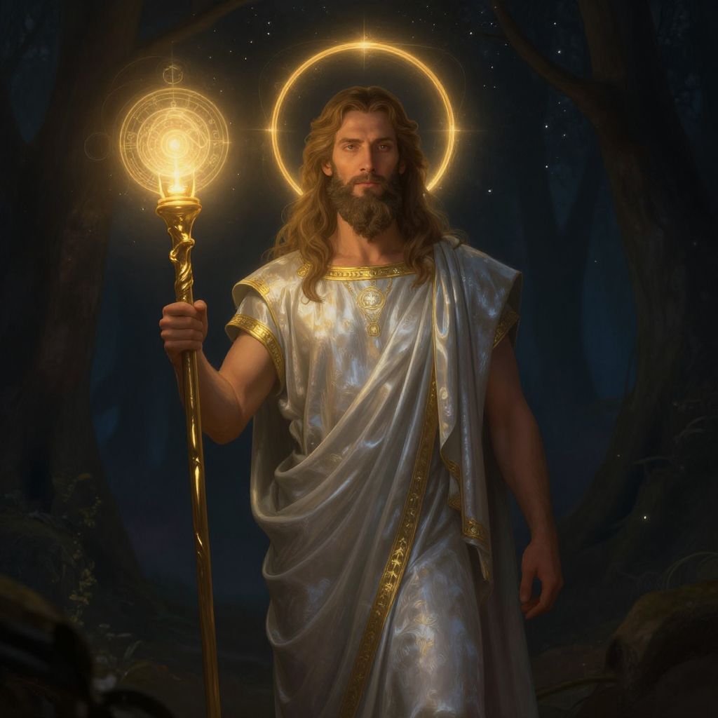 Photograph-like CGI of a bearded, glowing-eyed wizard in a dark robe, surrounded by mystical symbols, holding an open book, and raising a