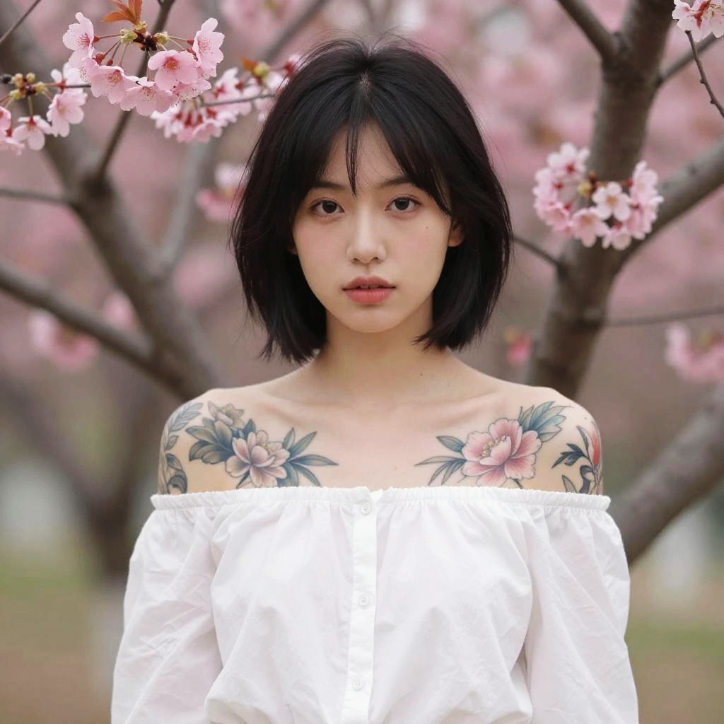 Asian woman with short black hair, floral shoulder tattoos, wearing off-shoulder white top, standing in blooming cherry blossom tree background. Photograph.