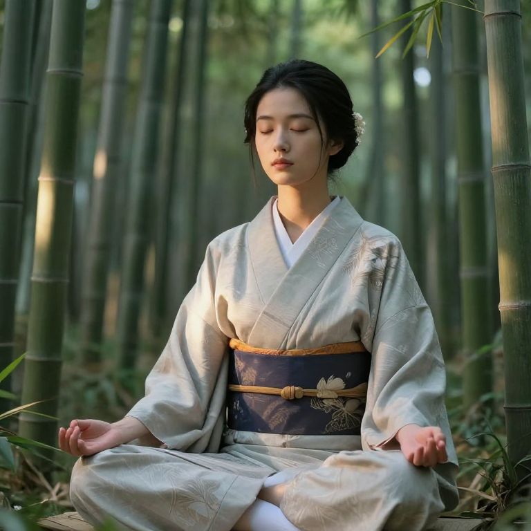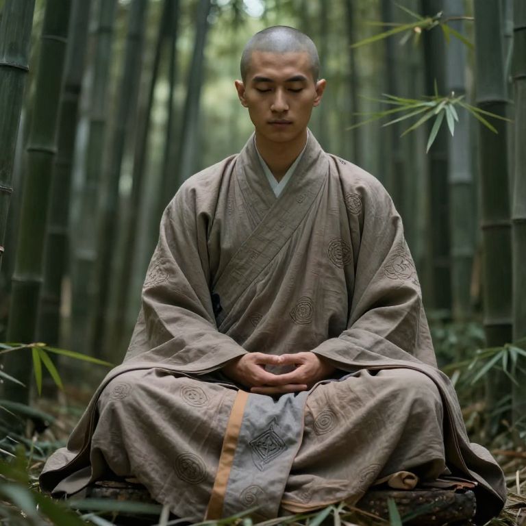 Sitama, a serene monk meditating in an ancient bamboo forest, gentle rays of light filtering through leaves, traditional robes blending with nature, soft color palette, tranquil atmosphere, highly detailed textures, concept art style.