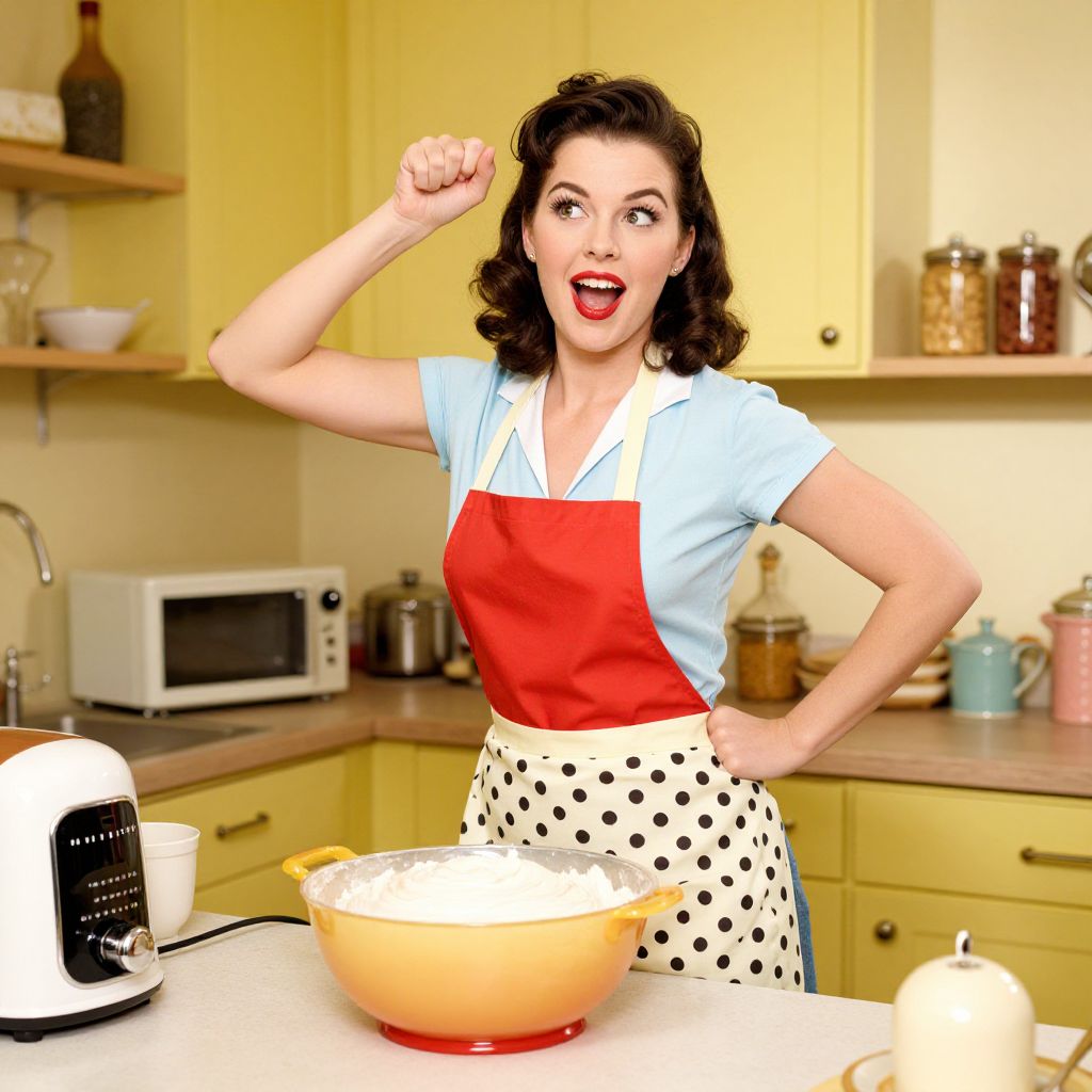 This vibrant digital illustration depicts a cheerful, fair-skinned woman with dark, wavy hair in a 1950s-style kitchen. She wears a light blue short-sleeved shirt under a red apron and a white polka-dotted apron. Her right arm is raised with a fist, and her mouth is open in a joyful expression. In front of her on the white countertop is a large, yellow mixing bowl. The background features yellow cabinets, a white microwave, jars, and a kettle. The image has a bright, colorful, and slightly retro aesthetic, emphasizing a nostalgic, mid-century feel.
