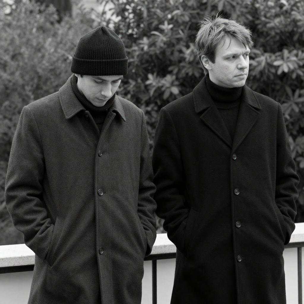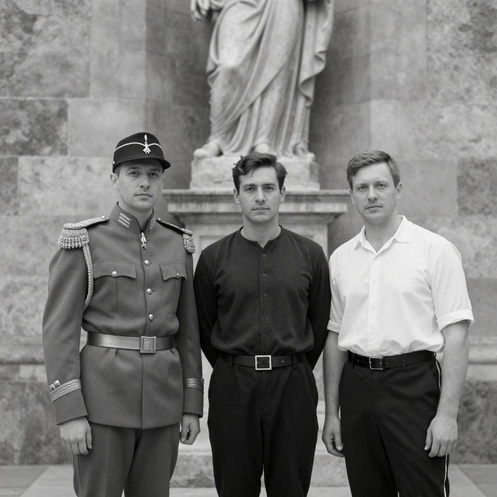 Black-and-white photograph of three men in historical costumes standing in front of a stone wall with a carved statue. The man on the left wears a military uniform with epaulettes and a hat, the middle man is in a dark, belted outfit, and the right man wears a short-sleeved shirt with a belt. The statue is detailed and ornate, positioned on a stone pedestal.