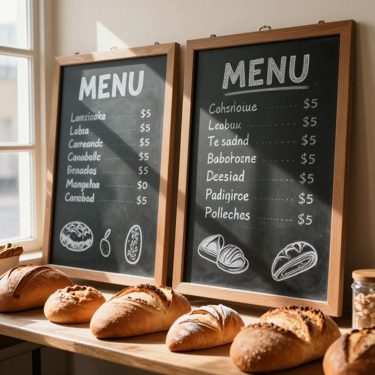 Menus displayed on vintage chalkboards in an old-fashioned bakery, hand-drawn typography with sketches of pastries and breads, surrounded by freshly baked goods, soft morning sunlight streaming through windows, warm and nostalgic feeling.