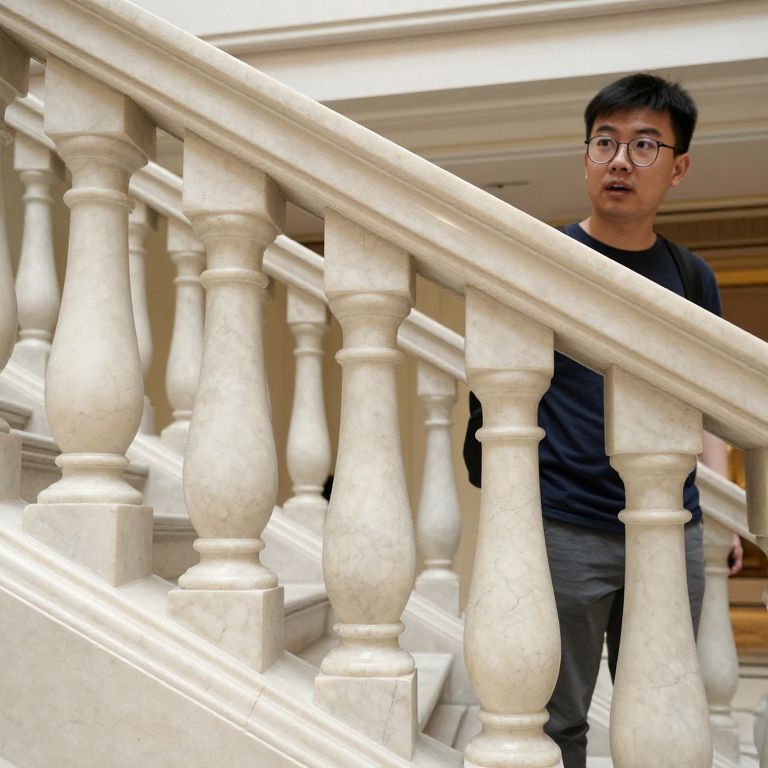 A detailed macro shot of a classic marble railing on a hotel lobby staircase, with fine surface cracks and subtle patterns, showing how light catches the stone in a polished finish, a young tourist with glasses and a curious expression standing just behind the railing, in a real-world urban environment.