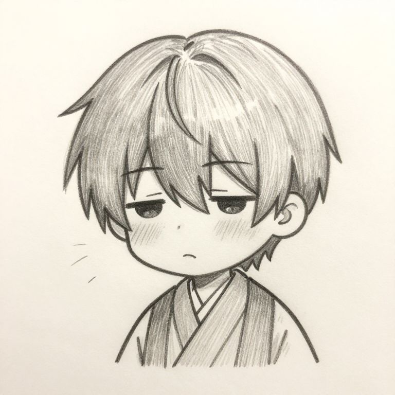 Pencil drawing of a cute anime boy character with hair falling into his face, showing a shy and embarrassed expression. The boy's cheeks are blushing with lines indicating fluster and bashfulness. The character is wearing traditional clothing and avoiding eye contact, captured in a soft monochrome style.