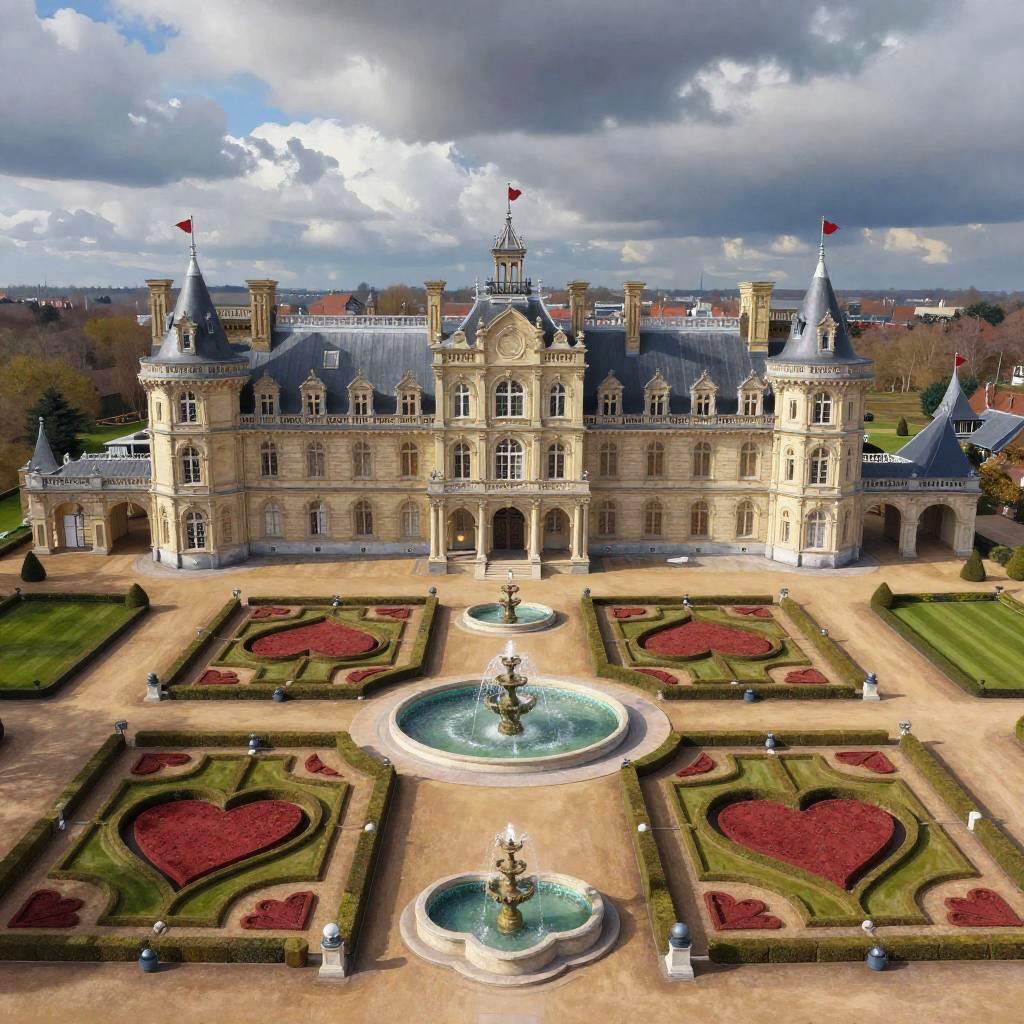 Photograph of a grand, Gothic-style stone mansion with two turrets, arched windows, and a black iron gate, set against a lush,
