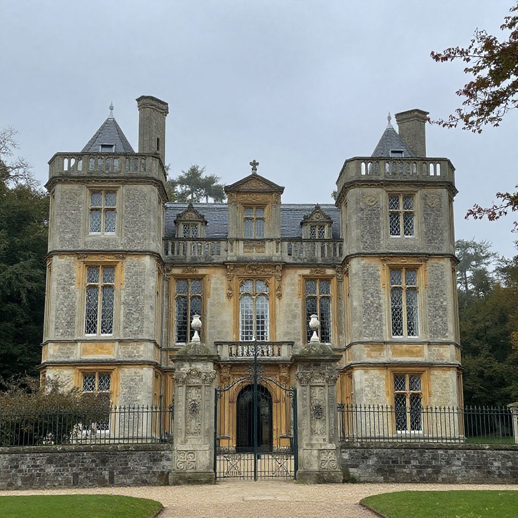 European manor house under cloudy skies, ornate windows, grand entrance with wrought iron gates, surrounded by dense forest, misty ambiance, historical elegance, early autumn