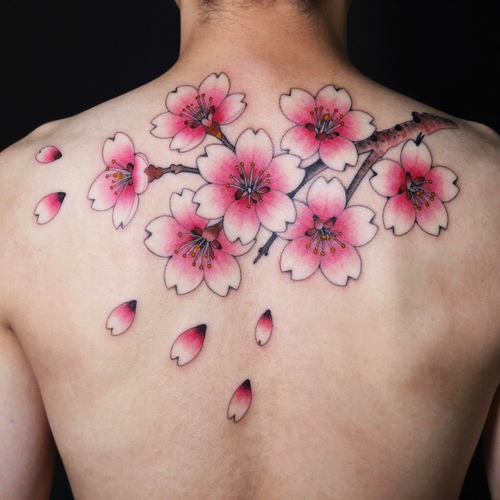 Close-up of male cherry blossom tattoo on back, vivid pink and white petals falling gently, minimalist yet detailed style, fine black outlines with soft gradient colors, inspired by Eastern art, capturing natural beauty and strength.